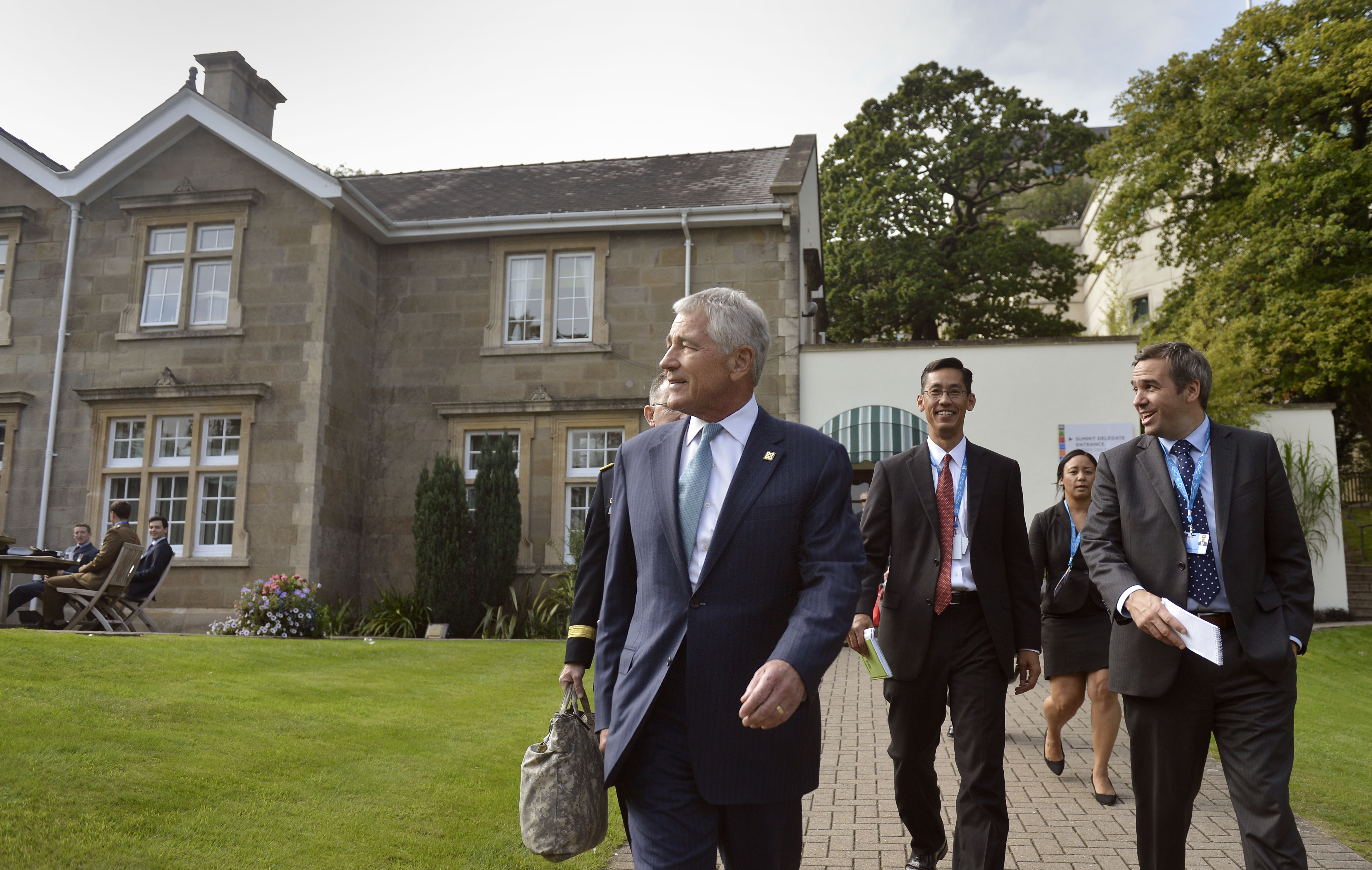 NATO summit at Celtic Manor Published October 10, 2014 at 4588 × 2908 in Hannah Iqbal at the Future Leaders Summit – Video U.S. Secretary of Defense Chuck Hagel, front, walks the grounds of the Celtic Manor Resort in Newport, Wales, with members of his staff as they head to a meeting during the 26th NATO summit Sept. 4, 2014. (DoD photo by Glenn Fawcett/Released)